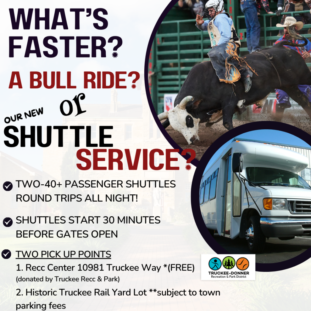 Truckee is a beautiful town full of wildlife and forests. Please be respectful of neighborhoods and local businesses. Please be patient with our volunteers. Parking has always been a challenge with the Truckee Pro Rodeo. Get creative, take TARTE, ride share, carpool, drop off, and arrive early. We want all our patrons to have a wonderful night of Rodeo. Plan ahead!